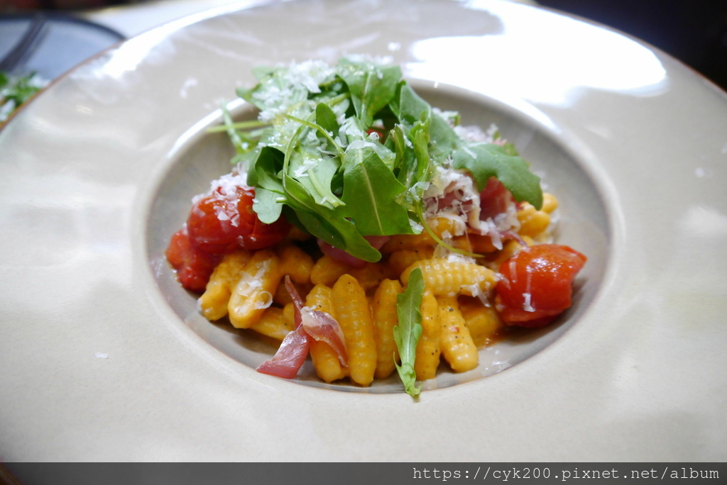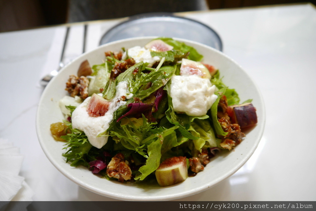 無花果起士沙拉,NT$320。無花果、時蔬、芝麻葉、薄荷、煙燻瑞卡達起司佐白巴薩米克醋。無花果與巴薩米克醋都是我的愛,清甜爽口的前菜。