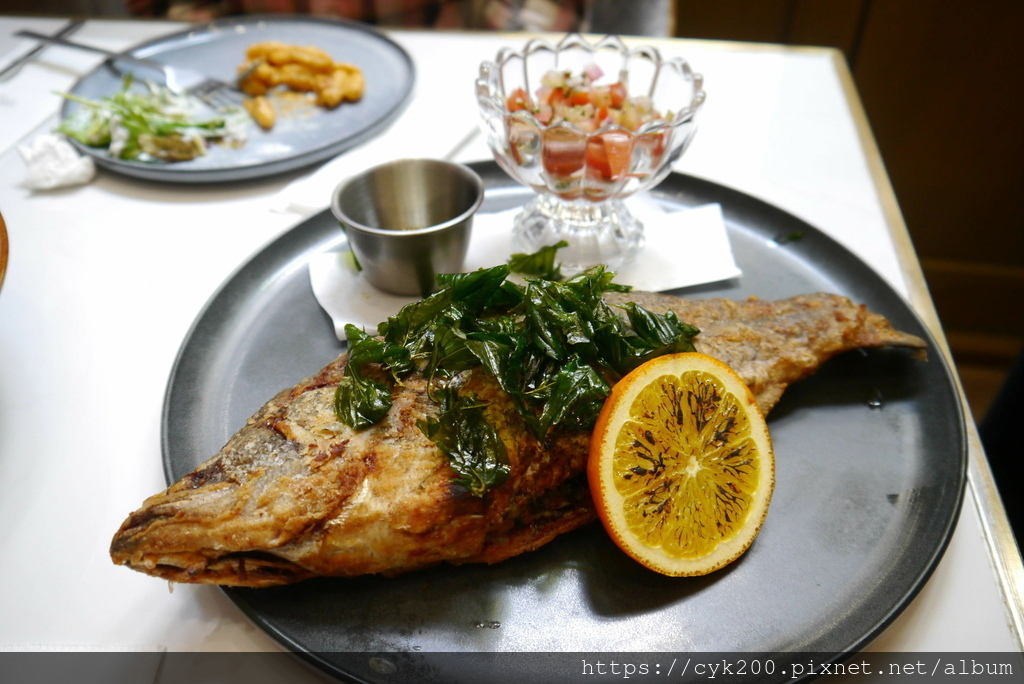 香料烤魚,NT$580。服務員會幫忙去魚骨,仍要留意小刺。魚皮鹹香酥脆,與佐餐的香料碎番茄很搭。有沾到魚腹香料的魚肉香留餘韻,但沒沾到香料或附著魚皮的魚肉沒味道。