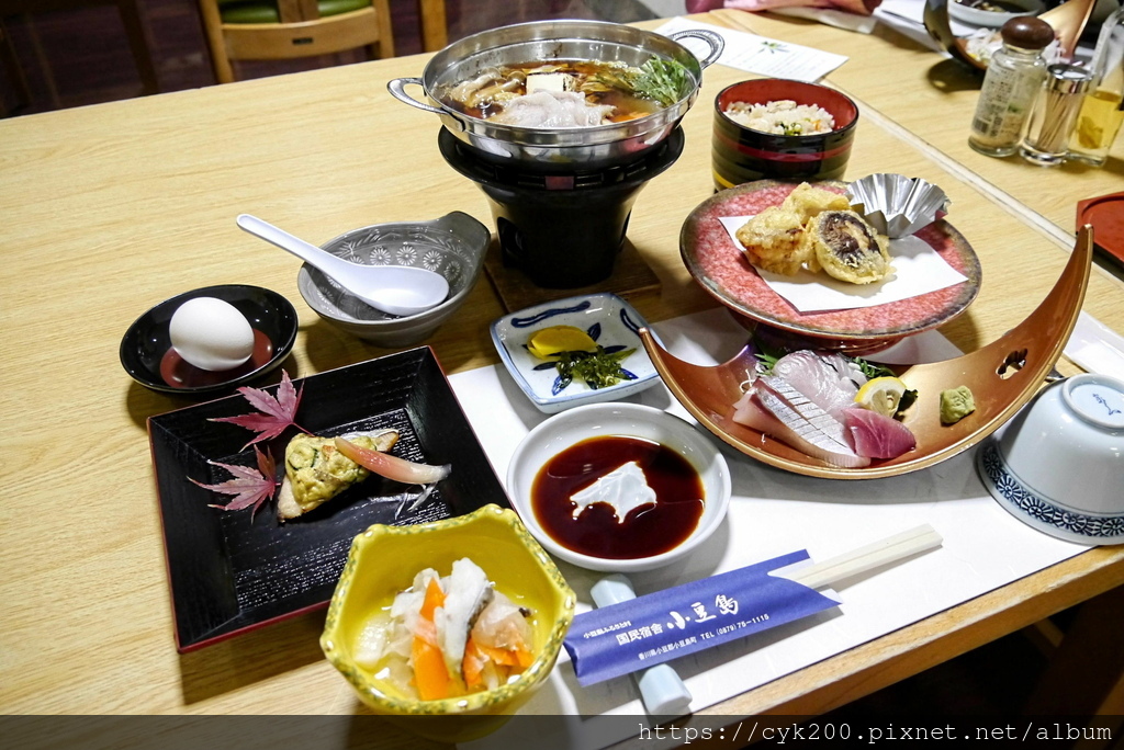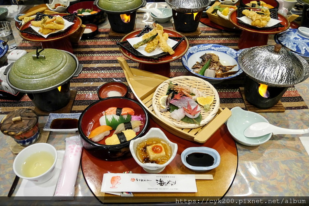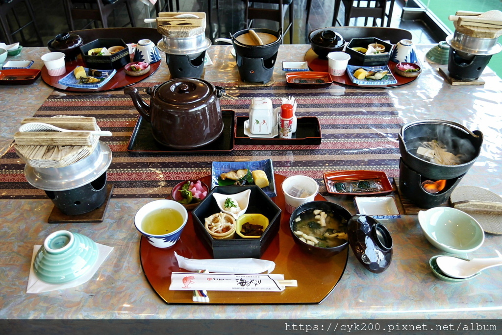 晚餐名為「源平会席」,比昨晚還豐盛、食材更好。我們14:00吃份量十足的午餐,18:30晚餐,飽到22點多才稍微消食去泡湯。