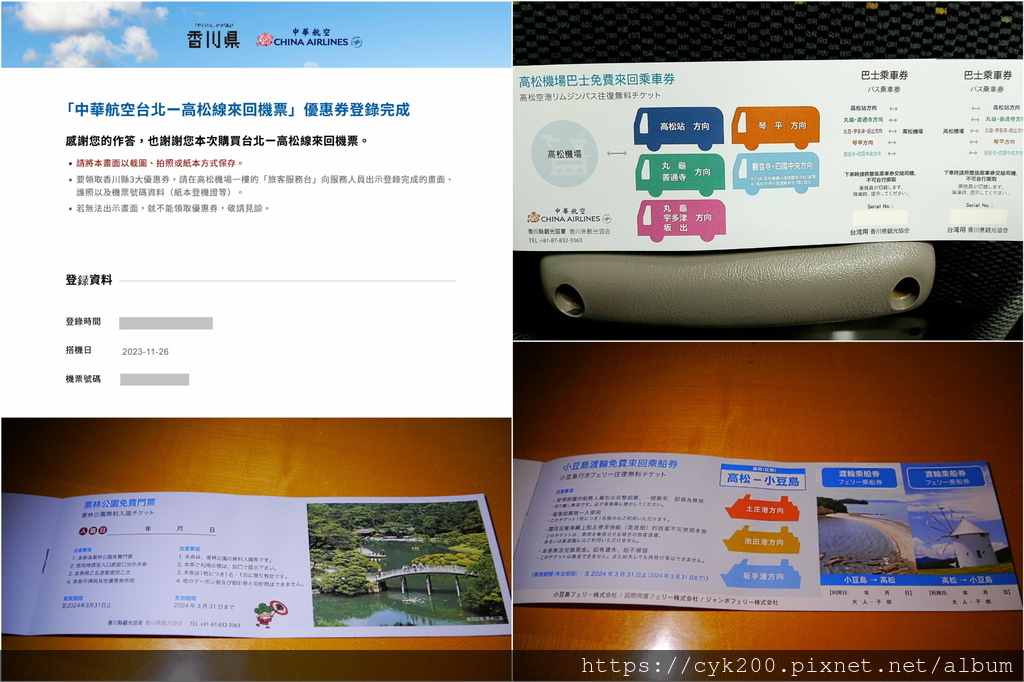 2024年3月31日前購買華航的台北-高松來回個人機票,到專屬網頁登錄資訊,在高松機場服務台出示截圖,可獲得機場巴士來回車票、栗林公園門票、高松-小豆島Ferry來回船票。本次旅程全用上了。