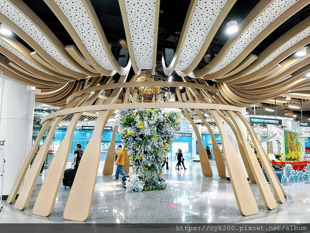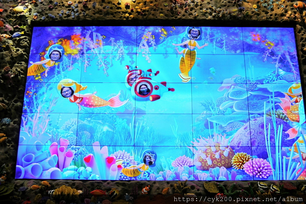 桃園機場第二航廈D1登機門往第一航廈連通道前,整面的海底世界拍照互動牆