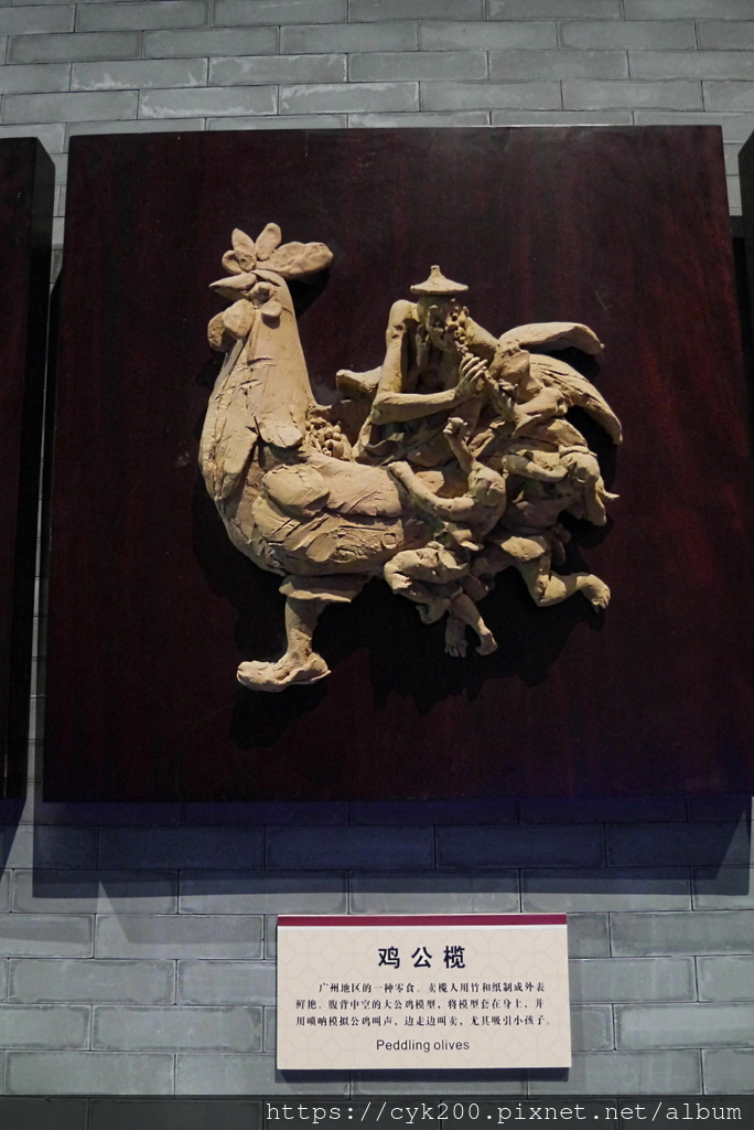 雞公欖:一種廣州零食。賣欖人用竹和紙製成外表鮮豔、腹背中空的大公雞模型,把模型套在身上,用嗩吶模擬公雞叫聲,邊走邊叫賣,特別吸引小孩子。
