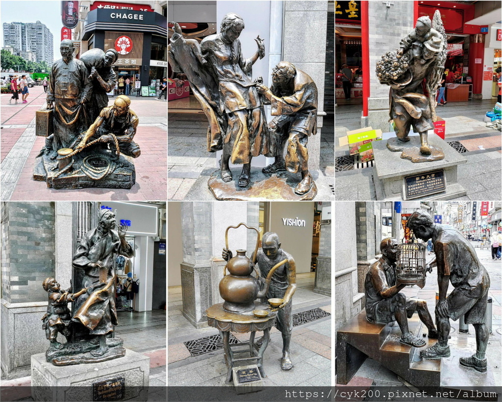 上下九廣場、下九路 街頭雕塑:昔日古渡、量衣、新年大吉、後生可畏-燒炮仗、涼茶、逗鳥