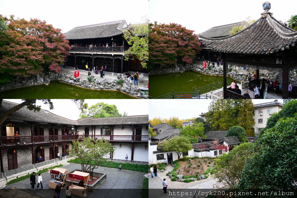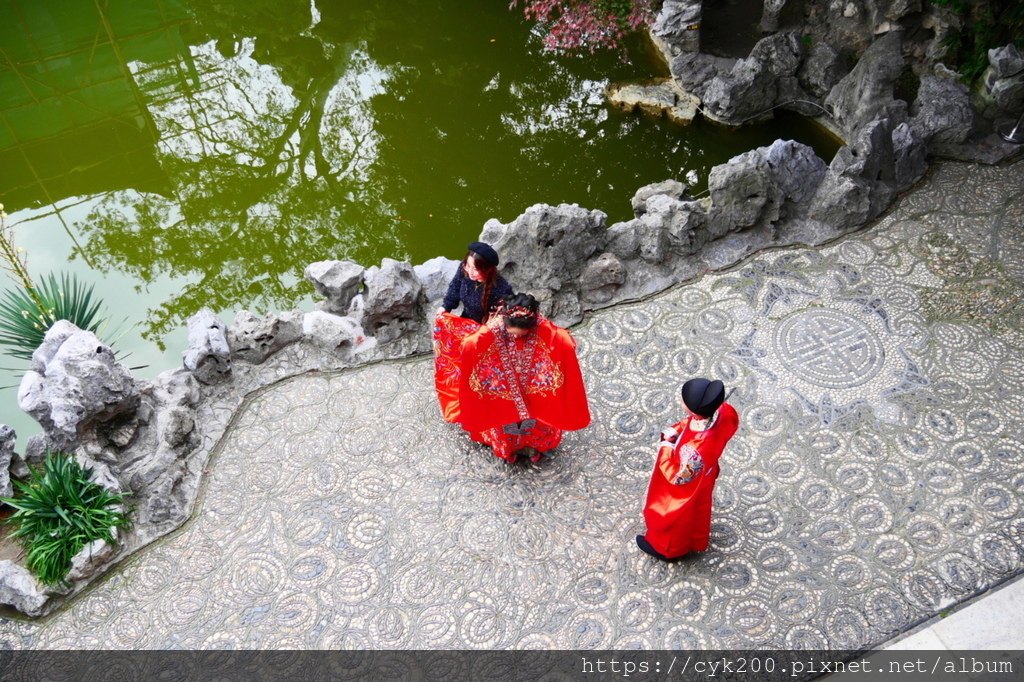 大陸景區流行租漢服拍照,何園卻有好幾組新人拍婚紗照。這組穿中式喜服,與眾不同。