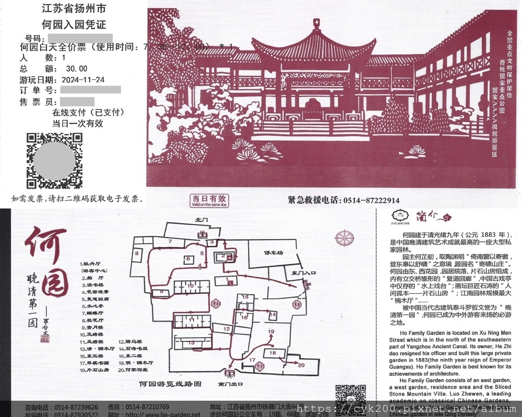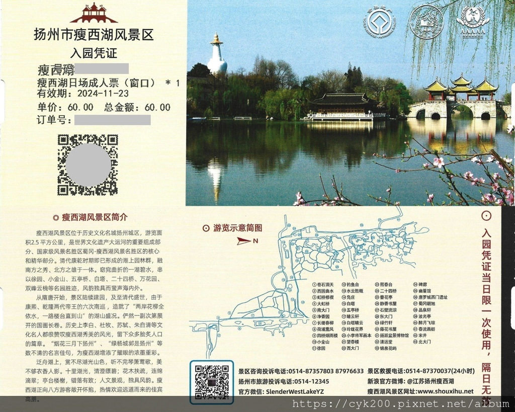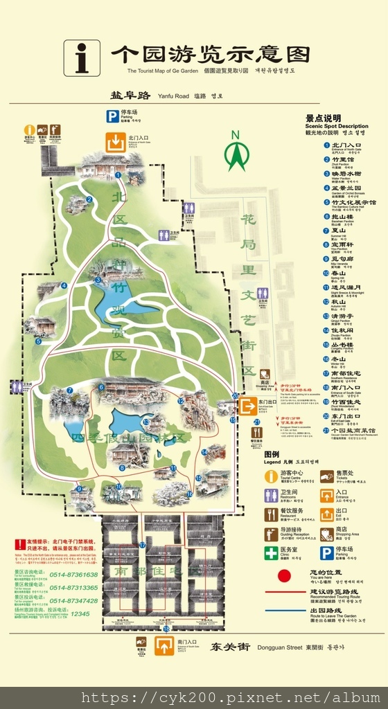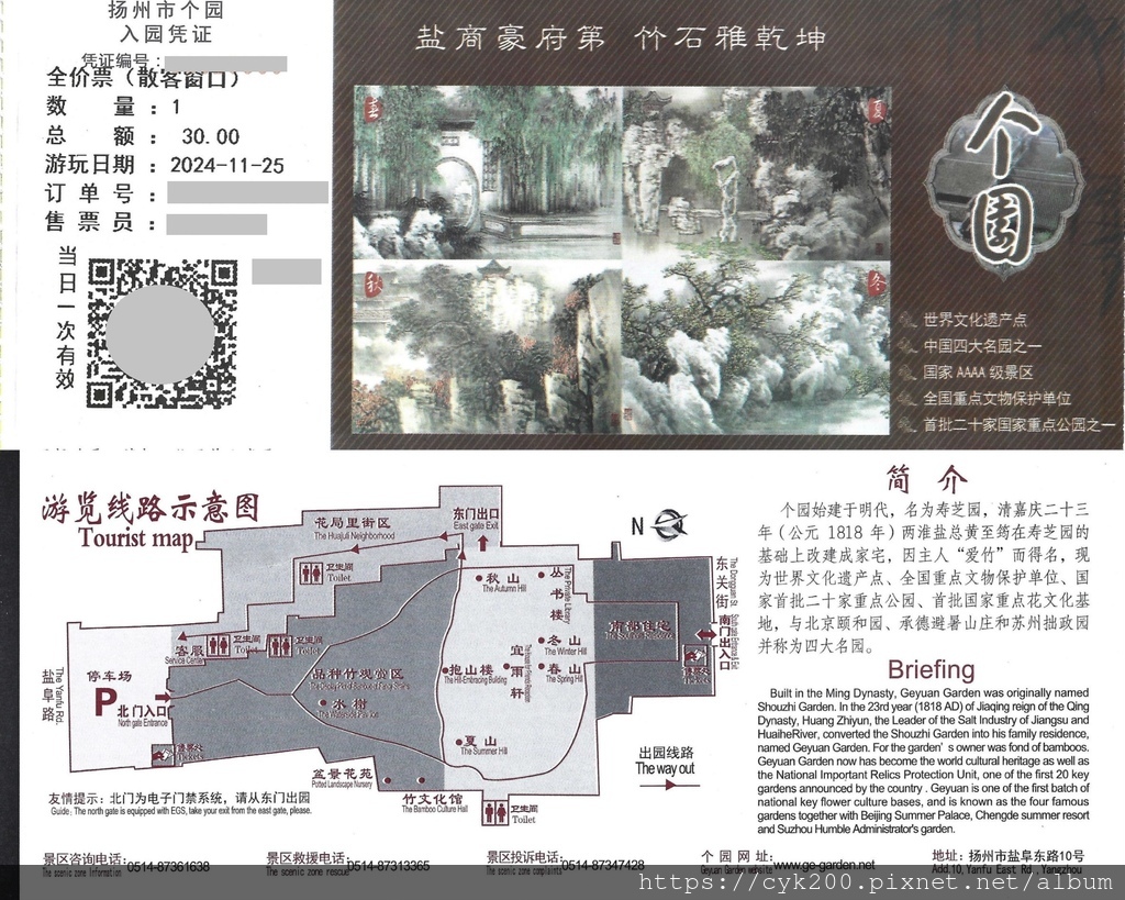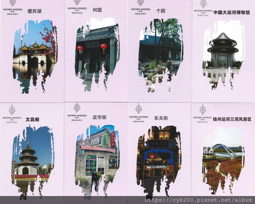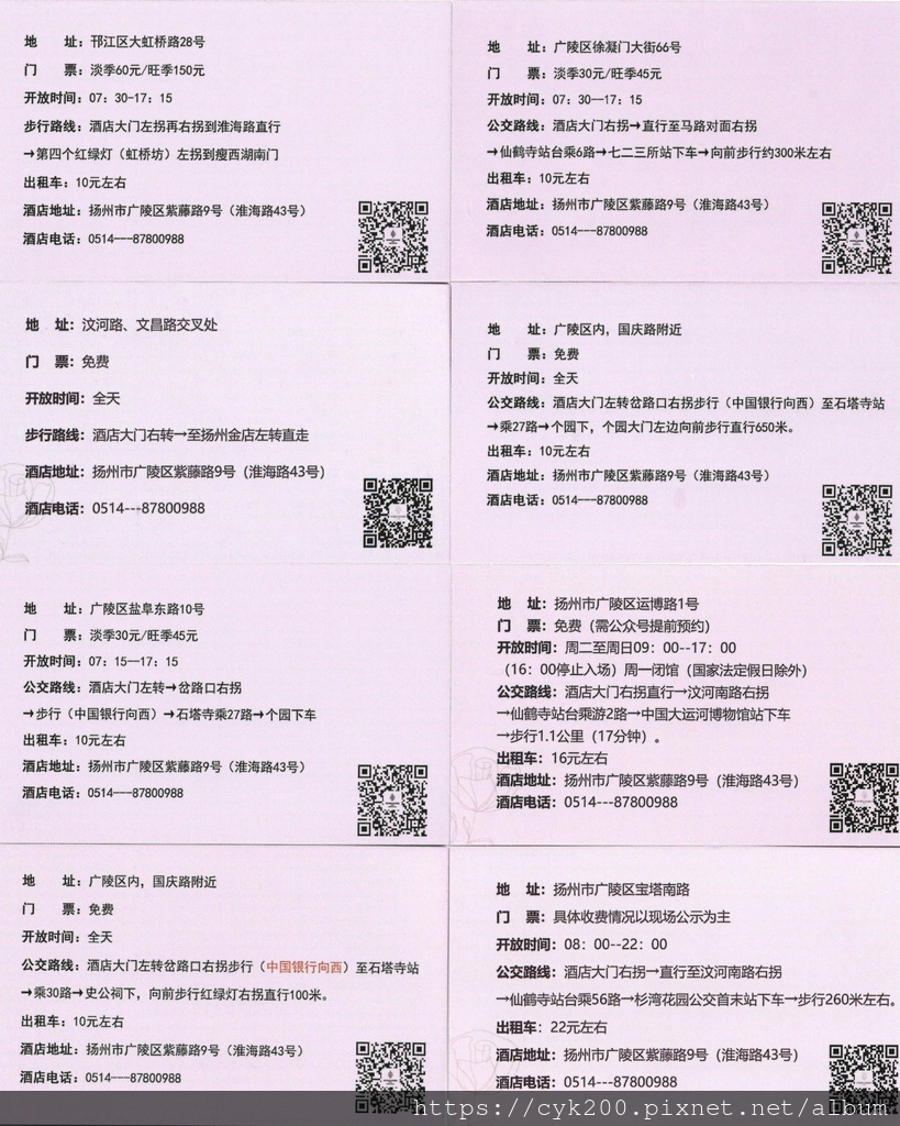 酒店前台有揚州各景點的小卡片,說明開放時間、門票價格、公共交通方式、預估出租車資。只拿有造訪的景點:瘦西湖、文昌閣、何園、皮市街、个園、東關街、中國大運河博物館、運河三灣景區